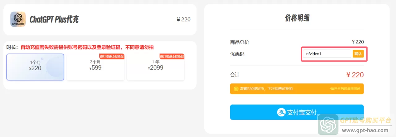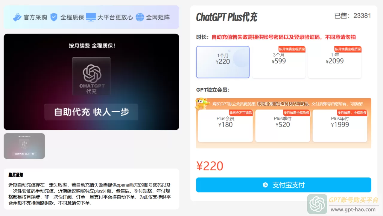 3、在购买页面,我们选择自己需要的购买时长,点击“支付宝支付”,代充是充值到自己的GPT账号。同时,他们还提供了GPT独立会员账号的购买,适合没有ChatGPT账号的网友,直接购买平台的已经开好会员GPT账号,价格还要相对实惠一点。
