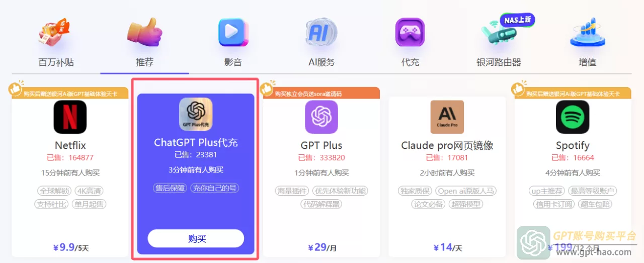 2、返回主页,在“推荐”栏目里面,我们就可以找到“ChatGPT Plus代充”,点击“购买”。