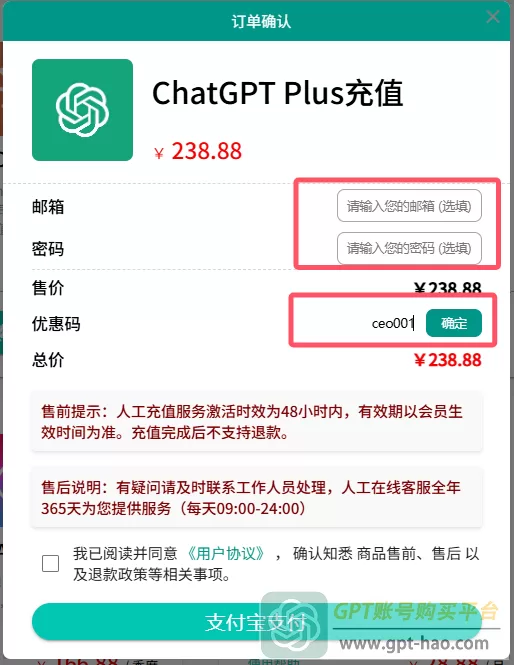 5、确认订单,邮箱和密码请输入你的ChatGPT账号的邮箱和密码,优惠码请填写:ceo001(可享受9折优惠),填写好以后,勾选用户协议,点击“支付宝支付”。