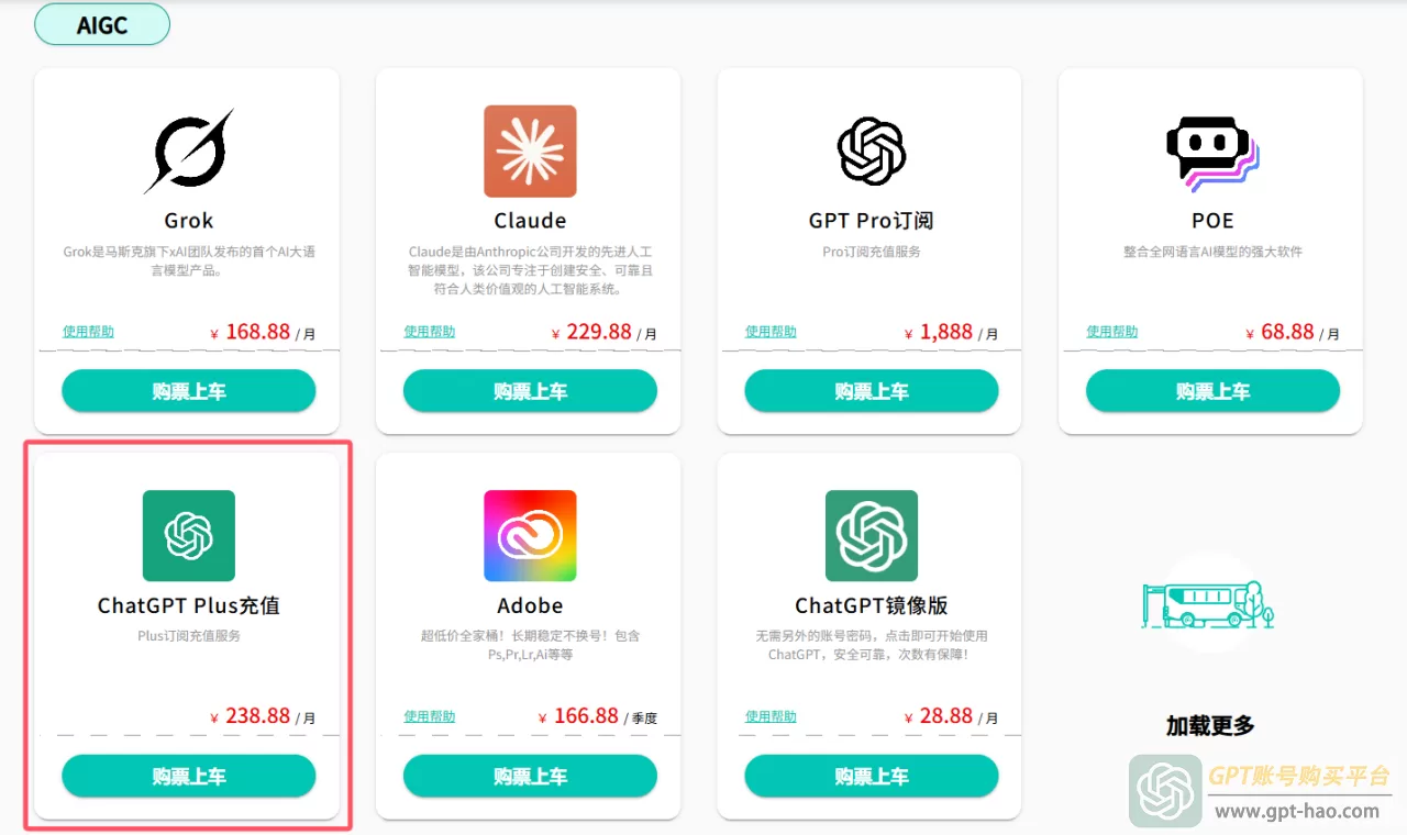 3、返回主页,在AIGC板块,找到“ChatGPT Plus充值”,点击“购票上车”。